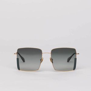Hand-crafted and sculpted, these sunglasses feature an oversized square style gold-coloured steel with acetate tabs in opaque dark green and steel arms with acetate tips. Green gradient tint 2-base lenses with 100% UV protection. Adjustable titanium nose pads. Built-in acetate nose pads and gold-toned hardware.
