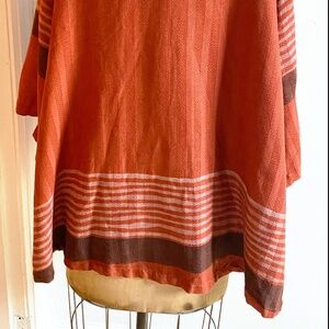 Beautiful cotton/rayon kimono style jacket from distinctive brand Kaliyana. Jacket is 30" long, with side vents and open front. Garment is made in Indonesia, and has both printed pattern and woven one.