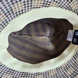 It is a trilby-style hat made from a lightweight, seamless, and knitted "Tropic" yarn, which is a blend of polyester and modacrylic. This material makes the hat comfortable and suitable for warm weather. The brim can be worn in different ways, such as up or down.
