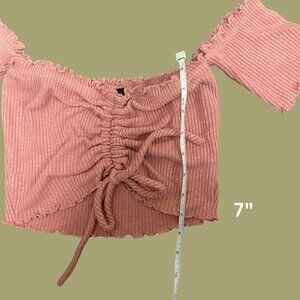 Flaunt your style in this Kanji dusty pink off-shoulder ruched crop top. Featuring a ribbed texture, adjustable front-tie ruching, and lettuce-edge trim, this piece is flirty yet chic. The off-shoulder design makes it perfect for date nights, festivals, or a trendy streetwear look when paired with jeans or skirts.
