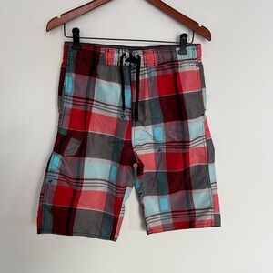 Vibrant plaid swim shorts. Features a drawstring waist. Perfect for summer. Size large for kids, like new.