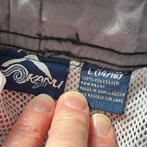 Vibrant plaid swim shorts. Features a drawstring waist. Perfect for summer. Size large for kids, like new.