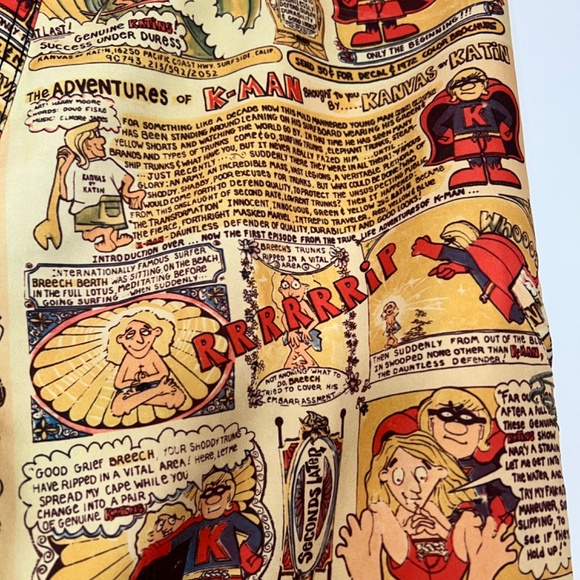 Kanvas By Katin presents these stylish and comfortable board shorts for men. Featuring allover comic strip graphics, they are the perfect unique shorts for a day at the beach or a surfing adventure. These size 33 swim trunks are designed to provide optimum performance and comfort. They are just over 22 inches long and have a zippered pocket on the front of the right leg along with embroidered ‘Kansas by Katin’ just below the pocket. They also feature a brand emblem patch at the bottom of the left leg.