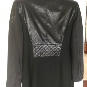 Above the knee black blazer with metallic quilting on front shoulders and back. Designed in Germany . Lined and has snap front buttons and zippered pockets.
