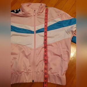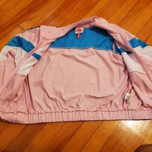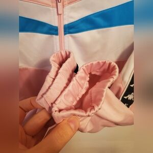 Kappa Authentic Football Esta Track Cropped Jacket Pink, White & Blue Turkis. Size L. Jacket length is 20 inches. Barely worn. Very small stain on the right shoulder as seen on pictures. No hole. Non smoking house.