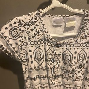 Toddler or child sized white jumpsuit in good condition. Has a cinched waist and a black Aztec pattern throughout. Also has three buttons that are functional but are hard to notice down the neckline in the middle and a front small pocket on one side of chest. Is a mid weight cotton material.