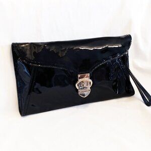 Karen Millen Black Patent Leather Clutch Bag-Leopard Print Interior & Hand Strap