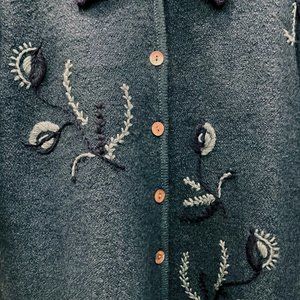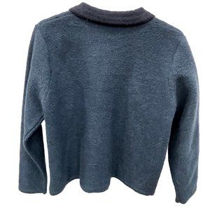 Stylish mid-weight cardigan made in Australia. 100% pure boiled wool with abalone buttons (extra button sewn inside). This sweater is a very dark blue with greenish undertones. The collar is a slightly magenta dark grey - beautiful tones. Sweater falls at hip. This piece is in excellent condition.