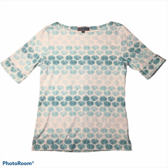 Karen Scott Ombré Seashells White Teal Boatneck Short Sleeve Cotton Top Small