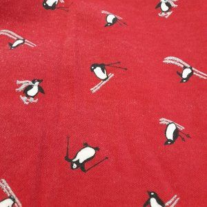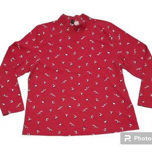 This mockneck shirt is a vibrant red, featuring a stylish and comfortable design with a high neckline. Playful red penguins adorn the shirt, adding a whimsical touch to the overall look. The long sleeves provide warmth and versatility, making it a trendy and cozy choice for any casual occasion.