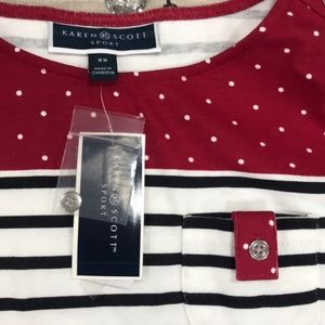 A crisp combination of two classics, this relaxed top from Karen Scott accents stripes with a vibrant dot print. Buttons at the sleeves polish the look.
