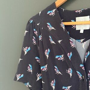 Karen Walker (Anthropologie) size 6 EUC dress with blue floral print. Features short sleeves and buttoned front. Ideal for versatile styling.