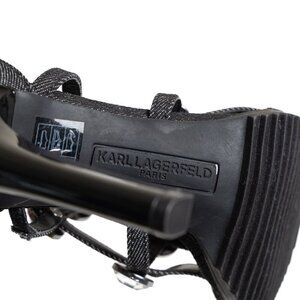Beautiful pair of Karl Lagerfield gladiator sandals. Adorned with faux crystals, these covered heel sandals can be paired with any casual outfit for an updated look.