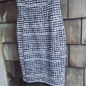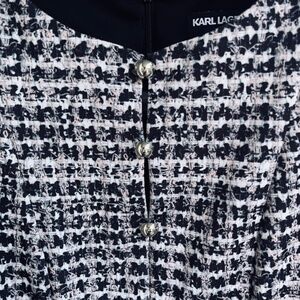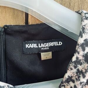 Chic and sophisticated Karl Lagerfeld sleeveless dress featuring a tailored silhouette and eye-catching black and white textured pattern. Made from high-quality polyester for a sleek, structured fit that’s perfect for the office, business events, or evening outings. Fully lined with a back zipper closure. Timeless, versatile, and in excellent condition.