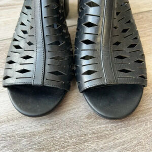 Edgy, seasonal style with a block heel and lasercut design, Block heel, 2.5", Leather upper, Open toe, Side grip tape buckle, Synthetic lining and sole.