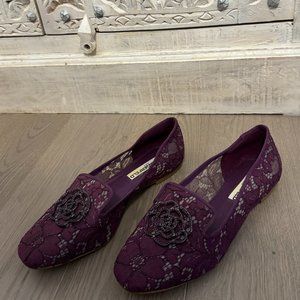 Beautiful purple lace Karl Lagerfeld loafers with diamond floral detailing on the front of the shoe.