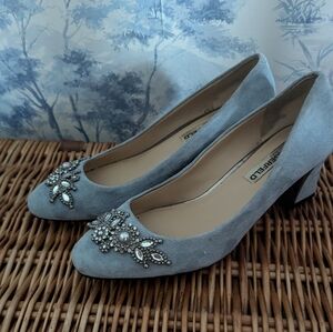 Lovely Karl Lagerfeld baby blue suede pump with pretty ornaments.