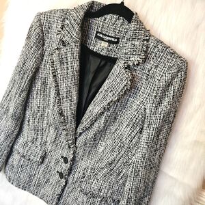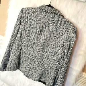 Make a statement with this impeccable Karl Lagerfeld Paris classic knit fringe blazer, a true luxury find at an unbelievable price! Crafted with exceptional quality and attention to detail, this timeless piece boasts a flawless knit construction and chic fringe trim. Perfect for elevating work attire or adding sophistication to evening looks. With its classic design and pristine condition, this blazer is an investment that will stand the test of time. Own a piece of high-end fashion at a fraction of the original cost!