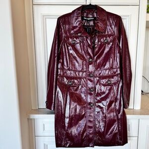 Turn heads in this stunning deep burgundy faux-leather trench coat by Karl Lagerfeld Paris. The glossy finish gives it a luxe, runway-ready look while maintaining a modern, wearable edge. Featuring a tailored silhouette, button-front closure, flap chest pockets, and waist seam detail for a flattering fit. Perfect for elevating any outfit from casual denim to evening chic.