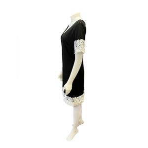 Black sheath dress white lace trim around hem and arms back zipper closure excellent stretch available has a slip short sleeve