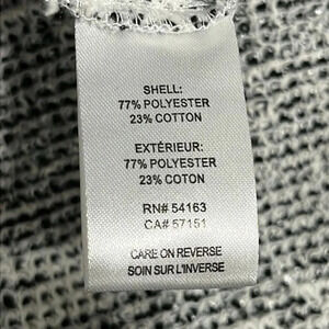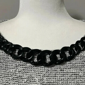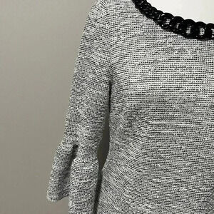 Excellent used condition. Hidden back zipper opening. 3/4 peplum cuff sleeves. Rounded neckline with fastened chain accent. Black / gray tweed look.