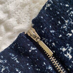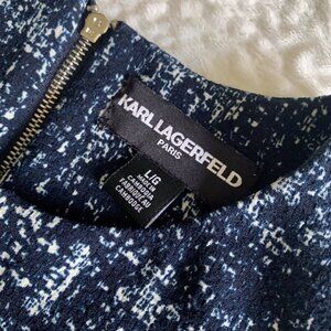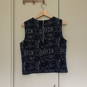This is a Karl Lagerfeld Paris boxy crop top has a beautiful navy, black and white print, with an exposed zipper in the back.