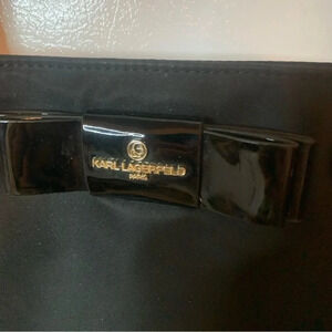 Top magnetic snap closure, Karl Lagerfeld signature front bow accent, inner zip & interior pockets.