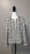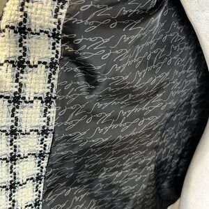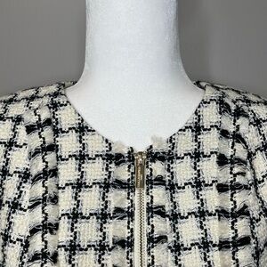 Excellent, like new condition. Black & ivory plaid tweed pattern with fringed accents. Front functional pockets. Lined. Gold full zip closure. Shoulder pads. Golf zipper sleeve cuffs.