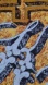 • Design: Bold, ornate central initial over a geometric, textured gold/ochre background, framed by a border featuring unique stylized stacked stone figures (resembling Inukshuk or cairns). The edges are finished with a rich black border.