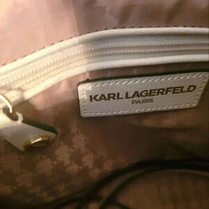 Elegant white bag with pink floral design. Features dual handles and gold-tone hardware. Perfect for any occasion.