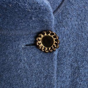 Karl Lagerfeld boiled wool cocoon coat in lovely blue color. Size small. Has one button at the top on the outside and one hidden one inside at the neck. Otherwise no other buttons. Two side pockets. Length is to mid-upper thigh (as seen in picture #3). Has the extra button still attached to the inside. 55% wool; 45% acrylic