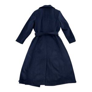 Stunning and sophisticated Karl Lagerfeld long wool coat in a deep navy blue. This piece has a timeless, elegant silhouette with a button-front closure and a matching waist belt that cinches beautifully for a flattering shape.