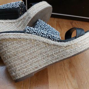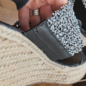 Cushy, comfy 1 1/4" platforms with 4" total height. Beaded mesh strap (silver, charcoal and white) with elasticized inset for comfortable fit and a 3/4" toe strap. There is a slightly darker tone along a glue line where the braided trim was glued onto the platform braid (see last photo) I didn't notice it until taking photos for listing.