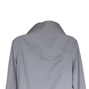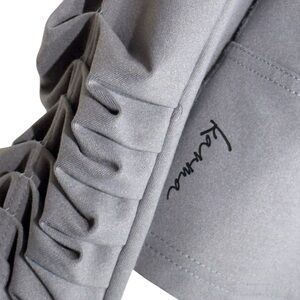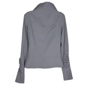 Karma Sam Suu Light Gray Zipper Front Ruffled Athletic Jacket is in very good preloved condition. Light gray in colour with the most interesting and fun ruffle cascading down the front. Off center zipper closure with snap at top. Ruched sleeves with thumb holes. Very stretchy! 88% nylon, 12% spandex. Machine wash gentle cold and hang to dry. Please note that stock pic is lighter gray.