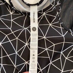 Item keywords: Karma tank top, built-in bra top, racerback tank, geometric print top, black and white activewear, wide strap sports top, yoga tank, gym training top, workout racerback, performance top, supportive sportswear, athleisure chic, strong woman style, studio to street, festival activewear, fitness outfit, capsule active basics