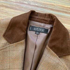 Kasper brand brown plaid equestrian-style blazer jacket. Brown corduroy contrast fabric at collar & pocket flaps. Back of jacket has back vent detail. Single button closure, fully lined. 63% polyester/34% rayon/3% spandex. Women's size "16W" - see below for garment measurements. Good pre-owned condition. The pictures show the actual item that you will receive.