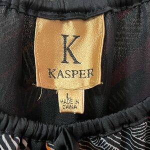 Elegant Kasper sheer dress with a striking black pink and orange pattern. Perfect for any occasion. Size large!