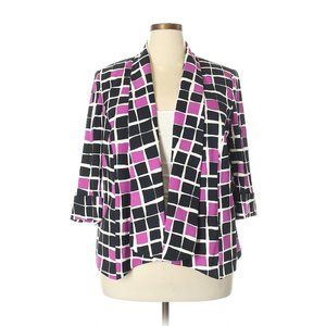 Stylish printed waterfall blazer in black and magenta. Super cute worn with jeans, slacks, or over a dress/skirt.