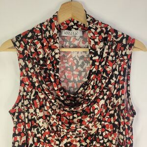 Elevate your wardrobe with this Kasper sleeveless cowl neck top. Featuring a striking red white and black pattern, this top is perfect for both casual and formal occasions. The surplus cowl neck design adds a touch of elegance. EUC