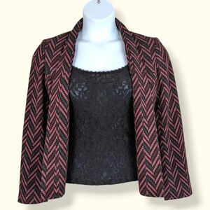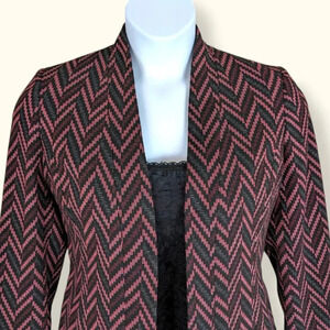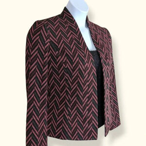 This buttonless blazer by Kasper is comfortable and current. Featuring a horizontal zigzag pattern with shades of pink and blue, this blazer looks great both up-close and from a distance. The shoulders have subtle padding and while there is no front closure, there is enough material in the front that the jacket still "closes". Both the lining and outer material are soft and flexible, letting the wearer move without restriction.