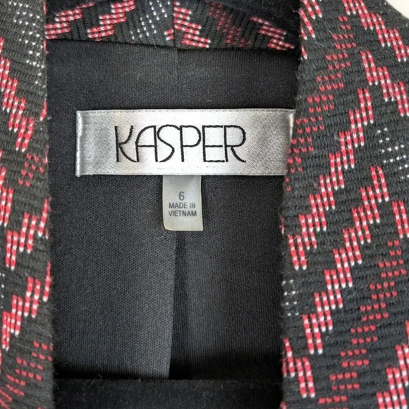 This buttonless blazer by Kasper is comfortable and current. Featuring a horizontal zigzag pattern with shades of pink and blue, this blazer looks great both up-close and from a distance. The shoulders have subtle padding and while there is no front closure, there is enough material in the front that the jacket still "closes". Both the lining and outer material are soft and flexible, letting the wearer move without restriction.