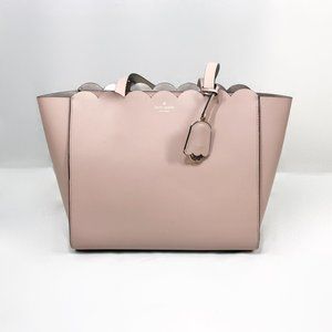 Light pink thick leather tote bag by Kate Spade. Back side of leather is a champagne metallic and hardware is gold tone. Has matching key ring on handle and scalloped top. Both front and back have openings and interior space zips closed with just an interior pouch pocket. All tags shown in pics. I used this very little so has no wear or damage to it just a few smudges to outside surface which may come off more - I just gave it a light wipe. This bag is just larger and heavier than I need so time to pass it on.