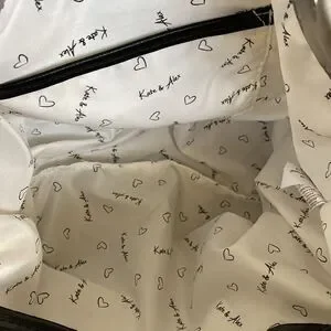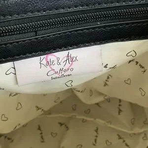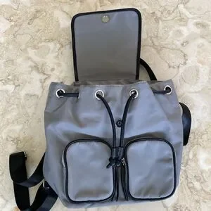 In practically new condition lovely lightweight grey nylon backpack from Kate & Alex Cuffaro. Features black vegan leather trim, black nylon adjustable straps, two exterior zippered pockets, drawstring closure plus magnetic snap under front flap. Interior is cloth lined and totally clean with a zippered pocket and a slip pocket.