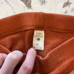Kate Quinn 4T Cupcake Shirt and Leggings Set. 100% organic cotton. Worn once. Cream shirt with blue and brown cupcakes. Leggings are a rusty brown colour. Small untreated mark on the back of the leggings as shown in photo.