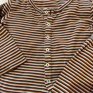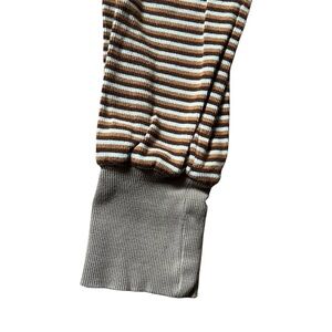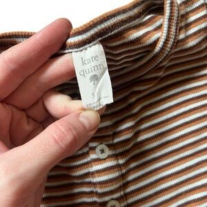 Adorable and cozy two-piece set by Kate Quinn, size 5. Made from soft organic cotton, this matching outfit features a striped button-front long sleeve shirt and coordinating elastic waist pants with ribbed cuffs. The neutral brown, white, and blue stripe palette is perfect for any season. High-quality and ethically made—Kate Quinn is known for comfort and sustainability in kidswear.