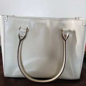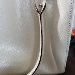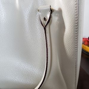 Ivory white leather bag with a cute pink red polka dots interior design. Still in good condition