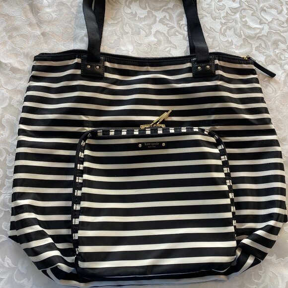 Kate Spade NY "All Play No Work" foldable black & white striped travel tote bag/purse. New without tags, never used, excellent condition. Tote bag folds up into small pouch approx 8" x 9" with gold-tone zip & wristlet for easy carrying. When opened, has 1 large pocket & 2 small pockets inside with her trademark fushia pink lining. Opened bag measures approx 17"W x 14"H x 5"D. Smoke-free home.