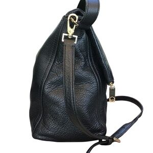 Stylish black pebbled leather bag with adjustable and detachable crossbody strap, pink Capital Kate fabric lining and gold hardware.