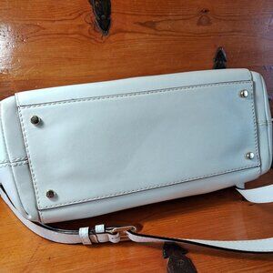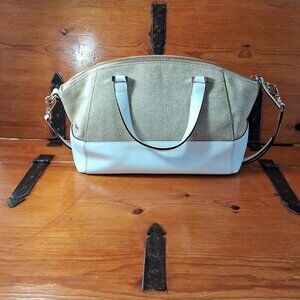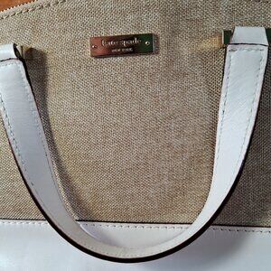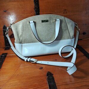 Kate Spade bag, ideal for vacations, cruises, and summer. White grained leather and crosshatch/straw pattern material. Its structured design and adjustable shoulder strap offer both style and versatility, making it perfect for everyday use.