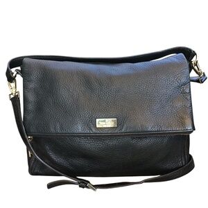 Stylish black pebbled leather bag with adjustable and detachable crossbody strap, pink Capital Kate fabric lining and gold hardware.